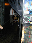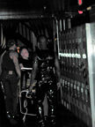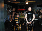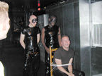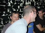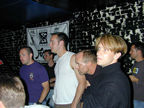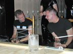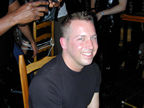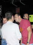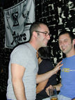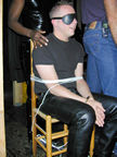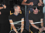On the evening of August 19th, our friends Russ and Rono arrived at our door, dressed all in black, wearing masks. They put handcuffs on us, and then led us to their car where they added blindfolds. They drove us around for a while, then made us walk down a block and across a street (still blindfolded!). We then entered a building, were led to the back, and then tied to two chairs. At this point the blindfolds came off and we saw about two dozen of our friends cheering. They then proceeded to ask us a set of questions separately, then we were re-united and they compared our answers. Sort of a gay Newlywed Game. We actually did better than most people thought we would!